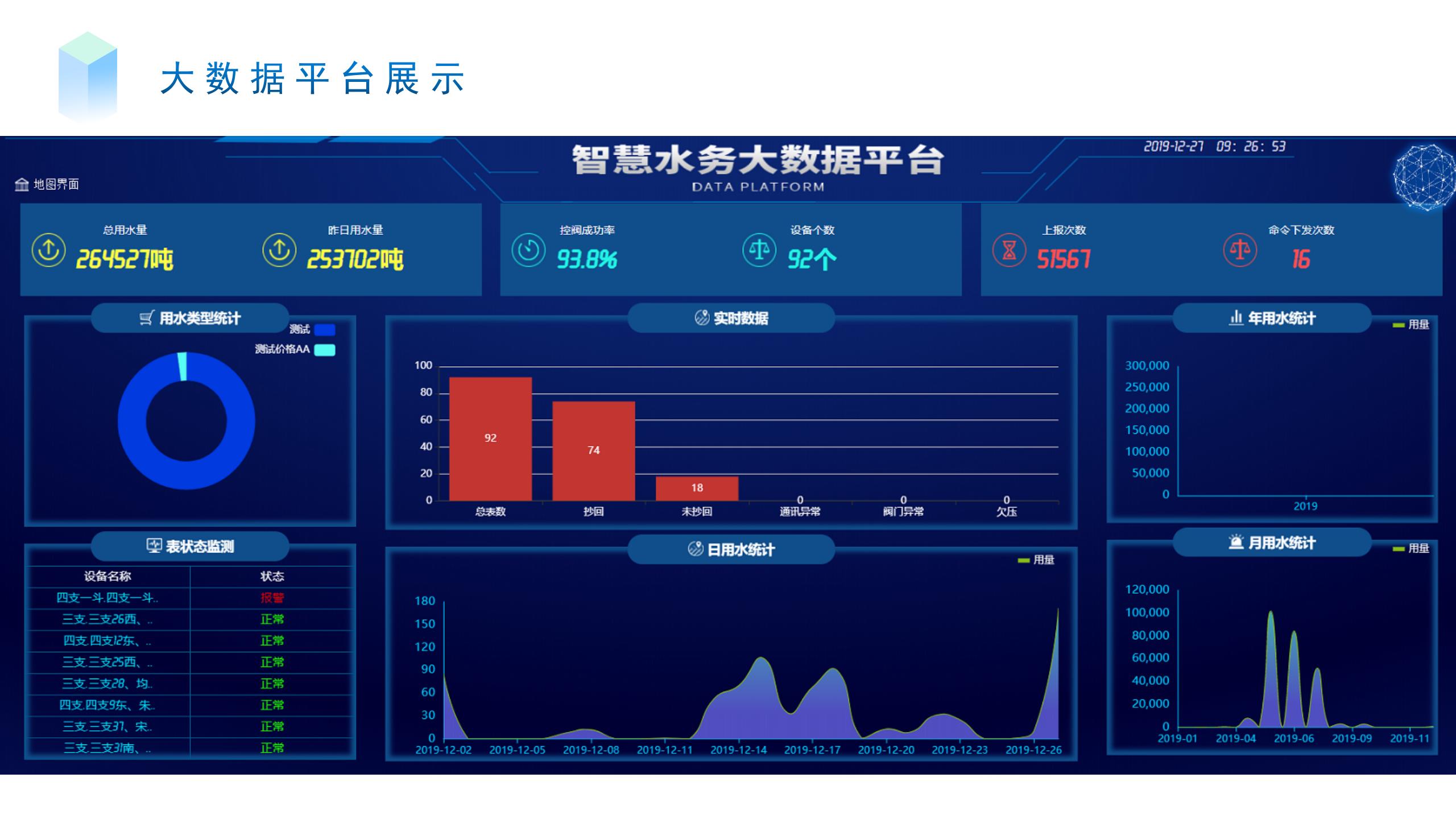 提升水務管理決策的科學化水平,利用大數據分析能力提升各類業務應用場景的識別、判斷、管控、執行水平,為水安全、水資源、水環境等決策提供輔助支撐。