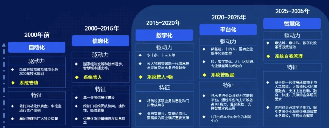從目前智慧水務行業整體發展現狀,智慧水務共分為五個階段:自動化階段、信息化階段、數字化階段、平臺化階段、智慧化階段。